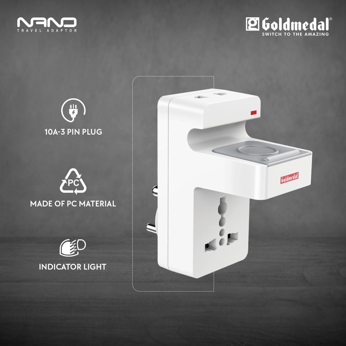 Goldmedal Nano 3 Pin Plug Travel Adaptor with Mobile Stand | LED Indicator | Multiplug for Home & Office | Supports 2-Pin & 3-Pin Plugs (Pack of 1) – White